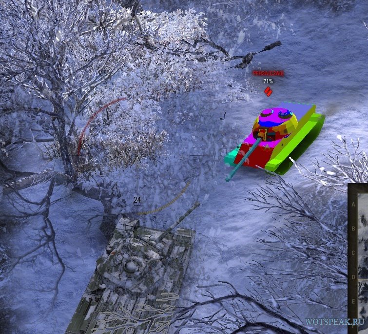 Еще одним плюсом станет стрельба на большие дистанции. Контур танка будет четко виден из-за разных домиков и камней. Теперь вы сможете попасть даже в торчащие из-за преграды пару пикселей.