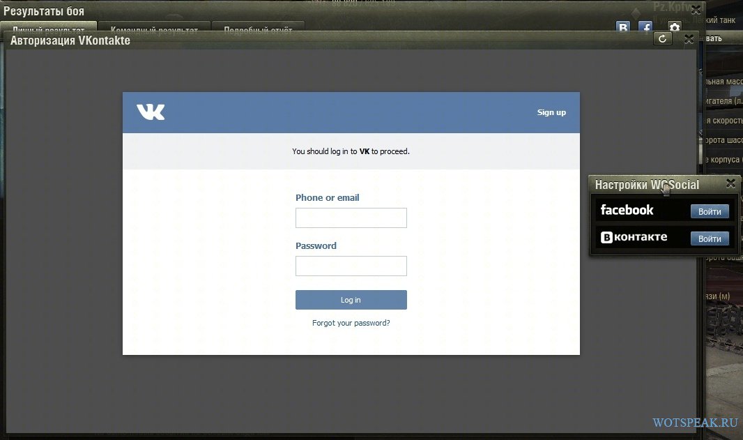 Интересный мод, автором которого является сама фирма-разработчик World of tanks Варгейминг. Название модификации WG Social и, как нетрудно догадаться из названия, позволяет синхронизировать клиент игры с вашим аккаунтом во Vkontakte и Facebook. Благодаря этой модификации Вы сможете размещать на своей странице скриншоты с результатами боя. Теперь вам не нужно использовать Printscren и совершать огромное количество других действий. Достаточно залогиниться в социальной сети и, сделав пару кликов, поделиться со всеми своими друзьями результатом успешного боя.