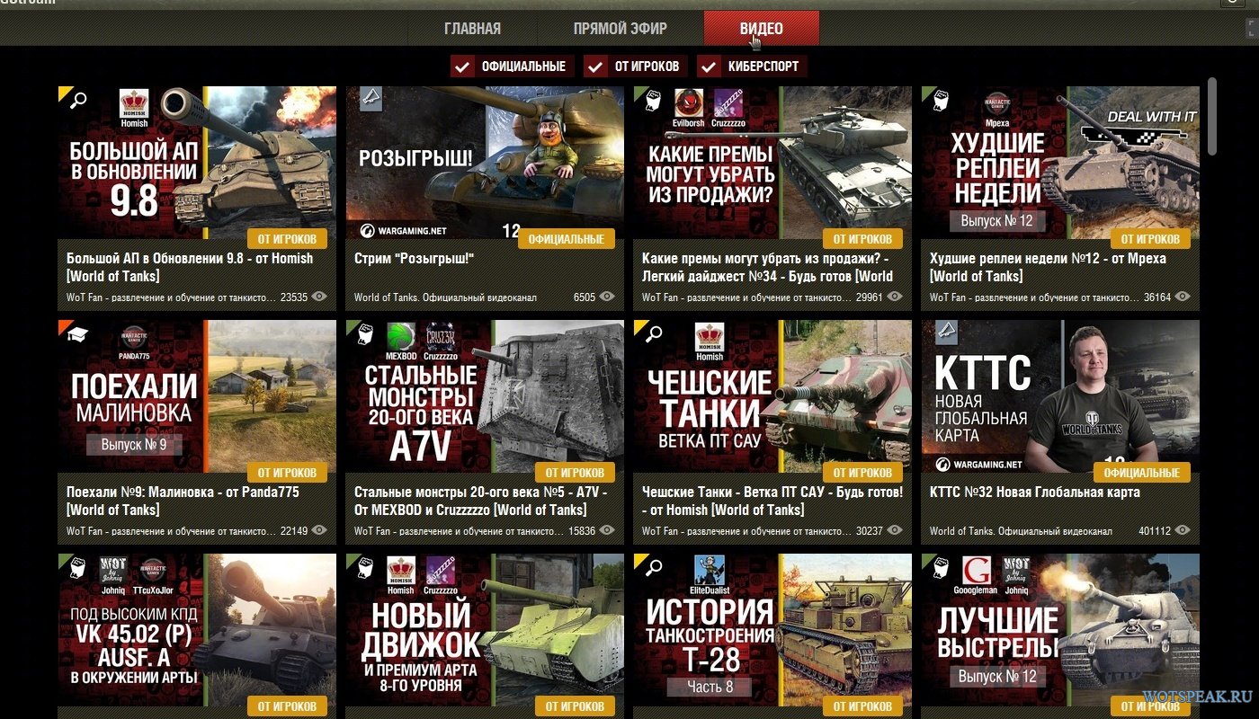 Не забыли в модификации ВГ Стрим 0.9.15 и про любителей просмотра обучающих, новостных или развлекательных видео про World of tanks. В специальной вкладке "Видео" размещаются лучшие ролики про вашу любимую игру.