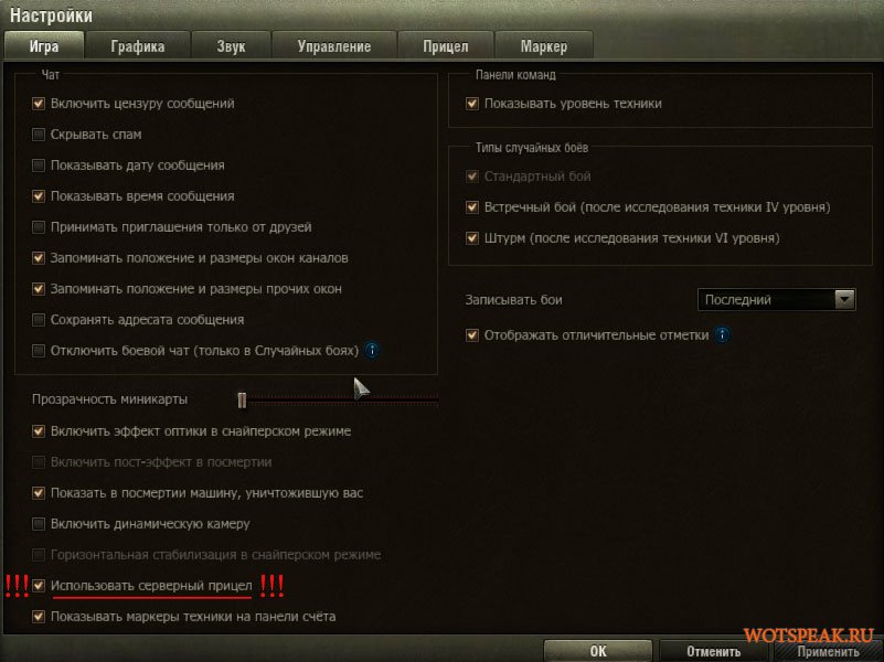 Каждый игрок мира танков не раз сталкивался с ситуацией, когда целишься в танк соперника, а снаряд летит в абсолютно другое место. Это происходит из-за рассинхронизации между вашим компьютером и серверами игры. Избежать неприятностей при стрельбе поможет серверный прицел для 0.9.16 World of Tanks. Но стандартный игровой прицел нравится не всем игрокам. Если Вы из их числа, советуем скачать данный мод. Если вы не знаете, как включить серверный прицел, то обратите внимание на скриншот настроек размещенный под этим текстом.Советуем использовать вместе с модом на быстрое включение серверного прицела кнопкой F2 в бою.