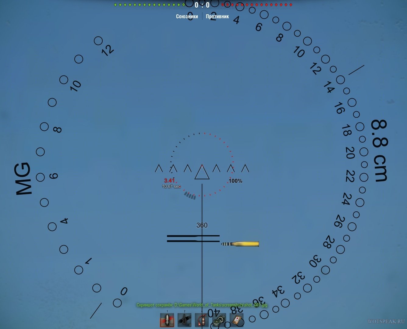 Исторический прицел в виде треугольника для World of tanks 0.9.15 мы обнаружили на одном из европейских ресурсах посвященным Миру Танков. Но прицел отлично подходит и для игры на русском сервере WOT.Прицел получился очень удобным и симпатичным. Экран не захламляется лишними данными. Все максимально оптимизировано для максимальной комфортности ведения стрельбы. Во время сражения вы сможете увидеть все необходимые параметры - время перезарядки, количество снарядов, анимацию процесса перезарядки, расстояние до цели и некоторые другие полезные индикаторы.