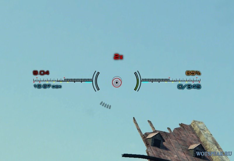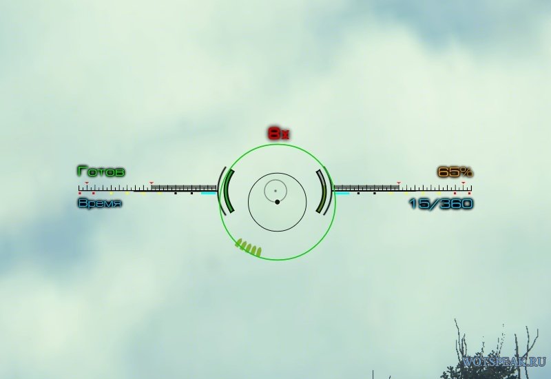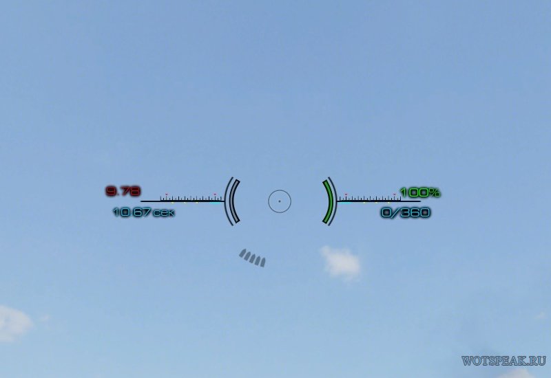 Во-вторых, в моде «Воин» реализована функция индикатора сведения. Зачастую, используя стандартный прицел, трудно понять, полностью свелось орудие или нет. Здесь же сработает сигнал – появятся и мигнут зеленым две горизонтальные полоски по бокам от круга с перекрестием.