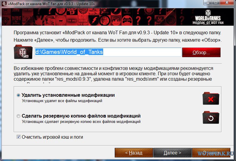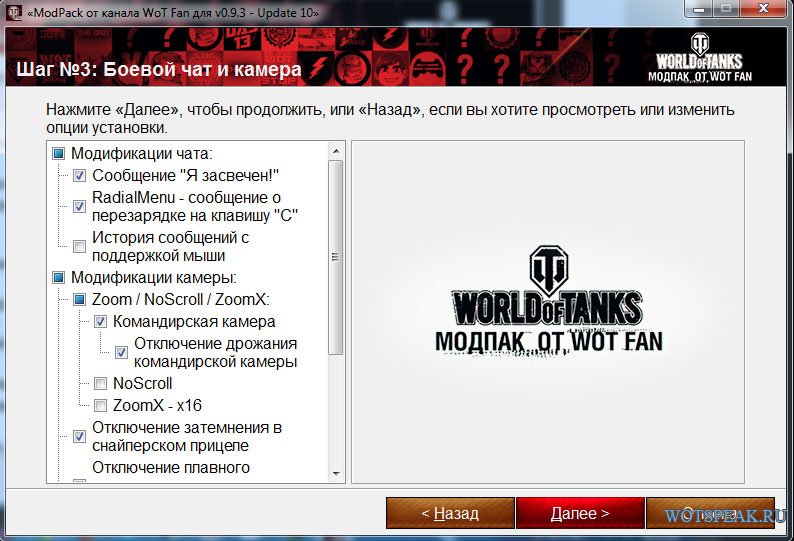 Перед Вами удобный модпак от Wot fan, известного Youtube канала для игроков World of tanks. В сборке модов Вот Фан подобраны самые необходимые и востребованные модификации для игрового клиента World of tanks. Модпак оснащен простым и понятным установщиком. Все моды сопровождены снимками их внешнего вида и звуковым сопровождением аудио-модов.В сборке есть все, что вам нужно: набор УГН, самые популярные прицелы, панели повреждений, полезные мелочи по улучшению геймплея, моды изменения чата, зум, звуковые модификации, улучшения внешнего вида ангара, тонкая настройка XVM и многое другое.